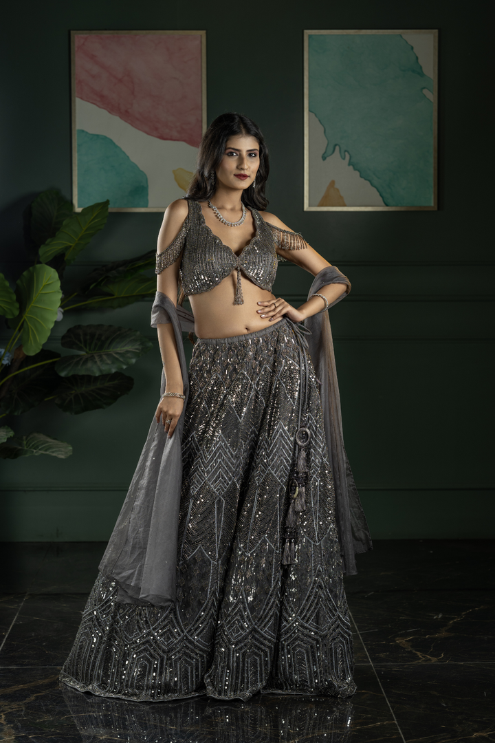Turn heads in this breathtaking steel grey net lehenga, intricately embellished with all-over sequin work that shimmers with every step.