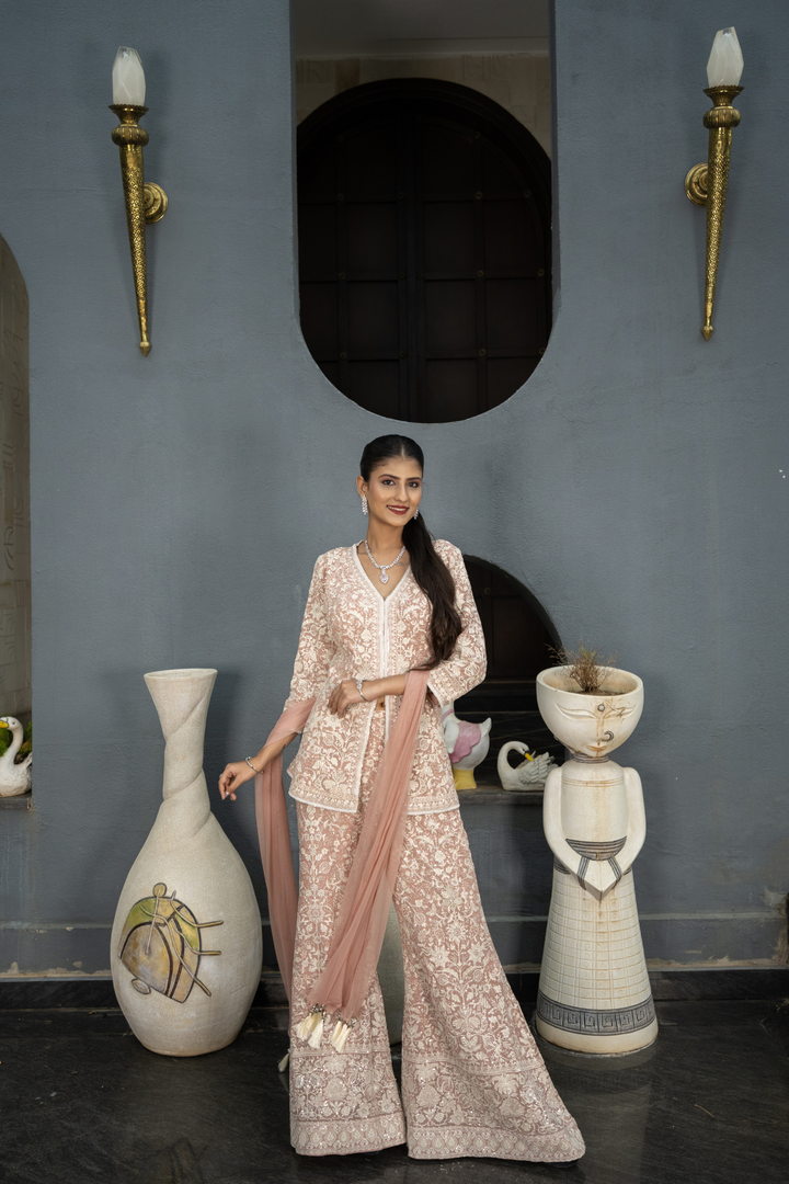 The matching plazo is adorned with fine Karachi embroidery, blending traditional craftsmanship with a modern silhouette. Perfect for festive occasions, parties, and evening gatherings this ensemble strikes the perfect balance of grace and glamour.